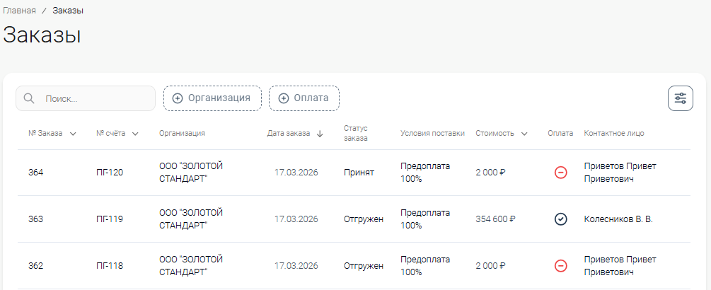 На странице «Заказы» доступен список всех Заказов, созданных по факту успешных Активаций.
