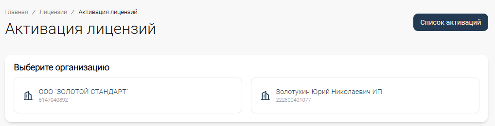 Для создания Активации будет предложено выбрать Организацию из предложенного списка. Выбор организации доступен только в случае наличия нескольких Организаций, для которых открыта возможность создания Активации.