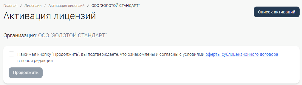 Для доступа к функционалу «Активация лицензий» необходимо совершить акцепт оферты Договора. Для этого: