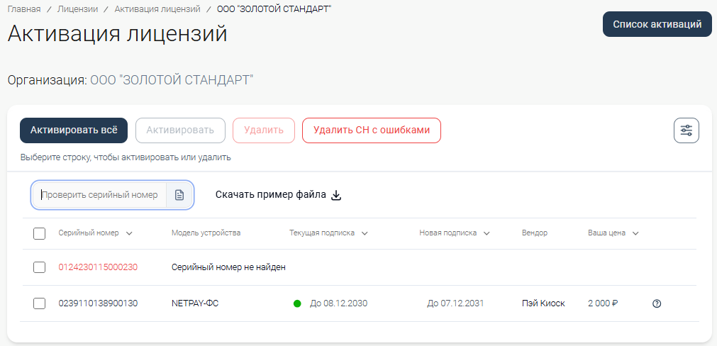 – если на серийный номер нельзя активировать Лицензию, сервис выдаст ошибку. На серийные номера с ошибкой сгенерировать лицензию нельзя. Ошибочные записи можно выбрать галочкой слева и нажать кнопку «Удалить» или нажать кнопку «Удалить СН с ошибками».