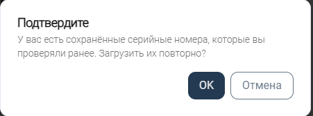 Дополнительно: если вы ранее ввели серийный номер для проверки и зашли более чем сутки спустя, то можно загрузить ранее сохраненные серийные номера по нажатию кнопки «ОК» в всплывающем окне или нажать кнопку «Отмена» и ввести новые серийные номера.