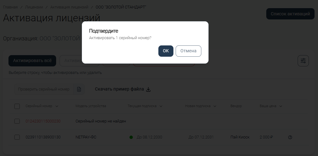Активация проверенных серийных номеров