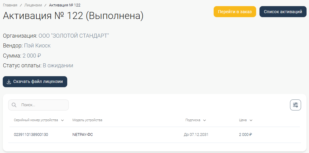 - № активации, Статус активации (всегда Выполнена), Вендор (поставщик устройства), Лицензий (количество), Стоимость