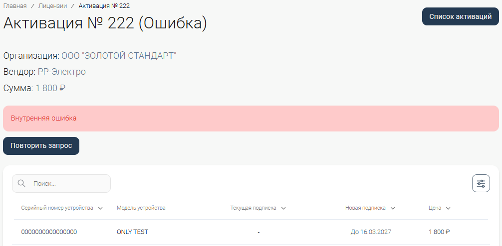- Если статус активации «Ошибка», то попробуйте создать новую активацию позже или нажмите на кнопку «Повторить запрос».