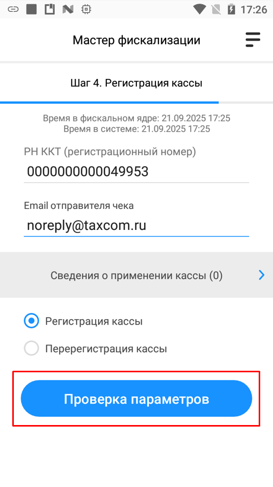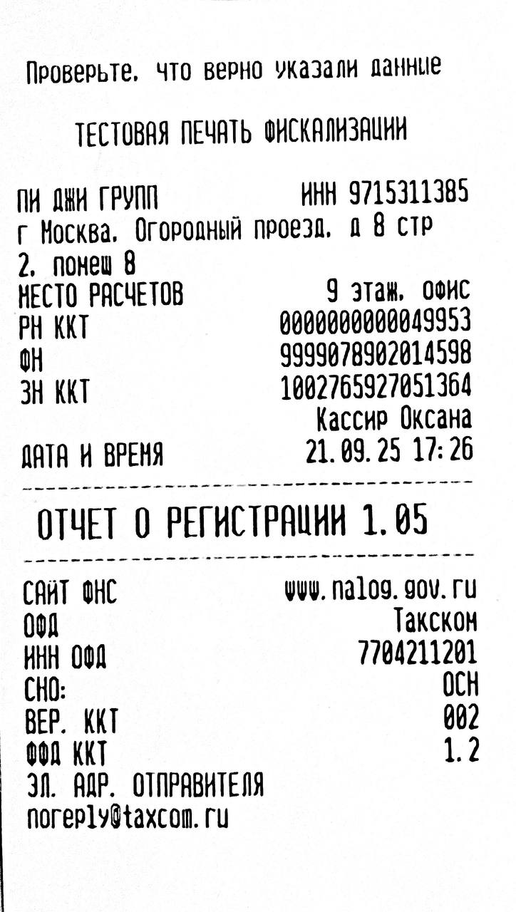 - Нажмите на кнопку “Проверка параметров”, касса распечатает тестовый отчет о регистрации для проверки данных. Убедитесь, что на нем все указано верно