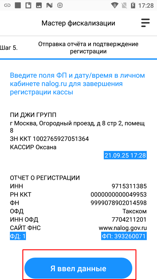 - Следуйте инструкции указанной на Шаге №5 (Введите поля ФП и дату/время в личном кабинете nalog.gov.ru для завершения перерегистрации)