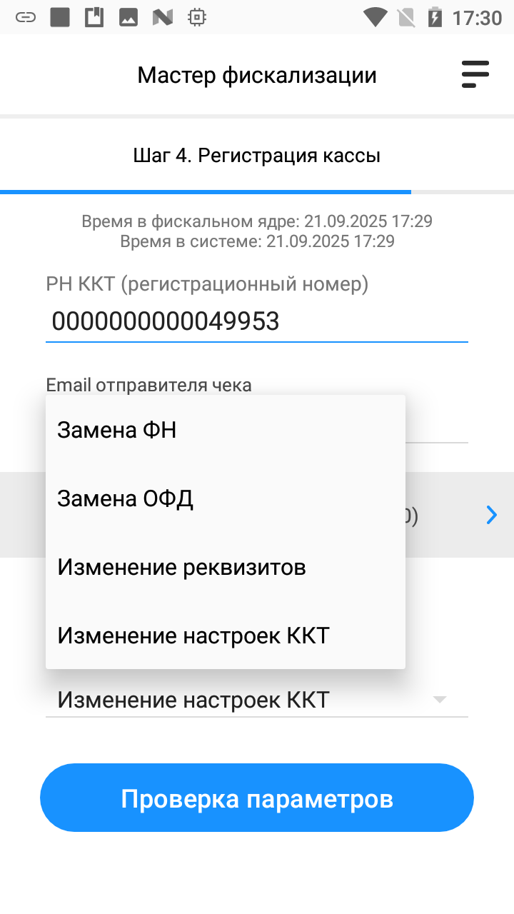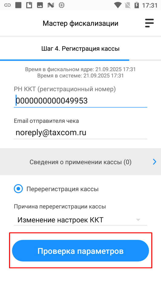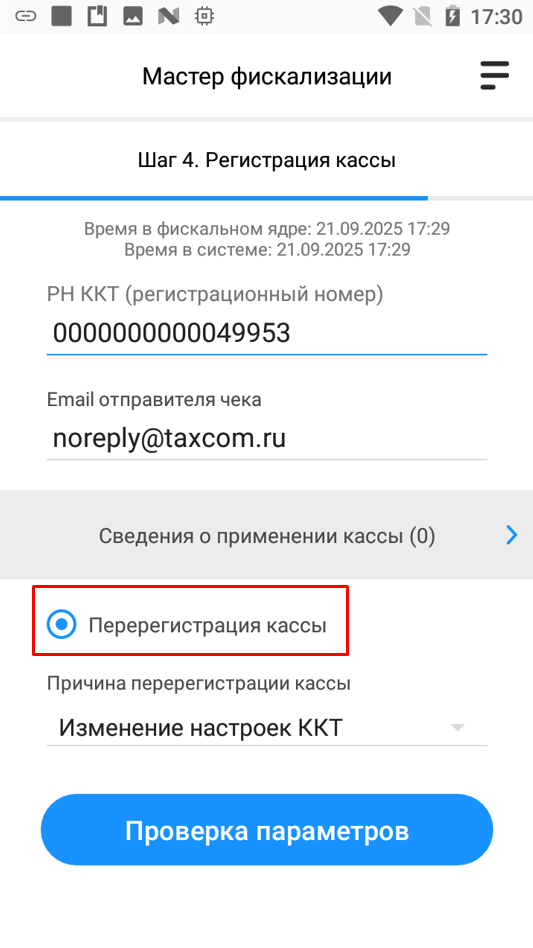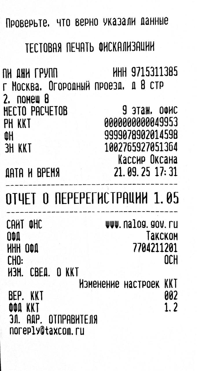 - Нажмите на кнопку “Проверка параметров”, касса распечатает тестовый отчет о перерегистрации для проверки данных. Убедитесь, что на нем все указано верно