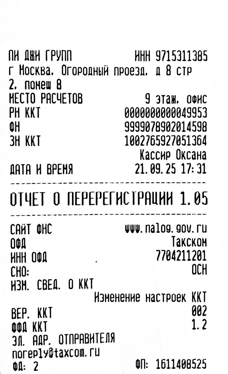 - По завершении фискализации аппарат напечатает документ о перерегистрации и выведет информацию о регистрации на главный экран
