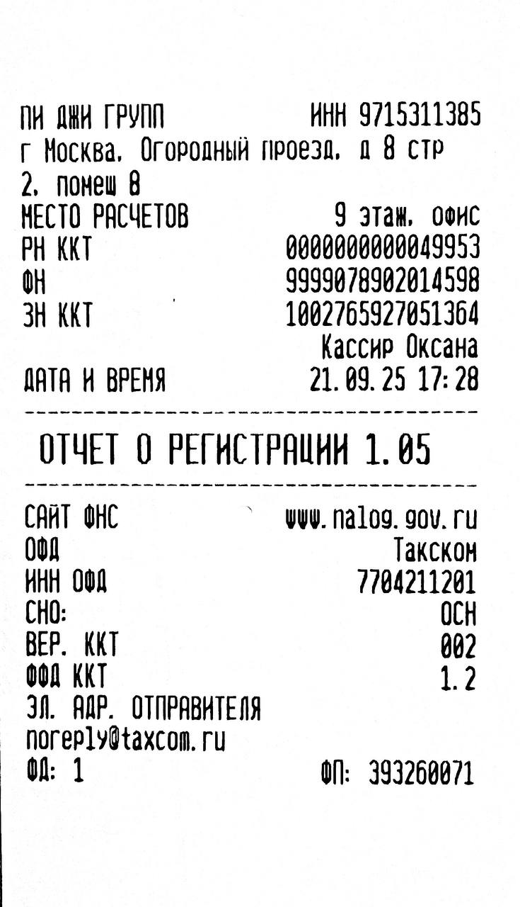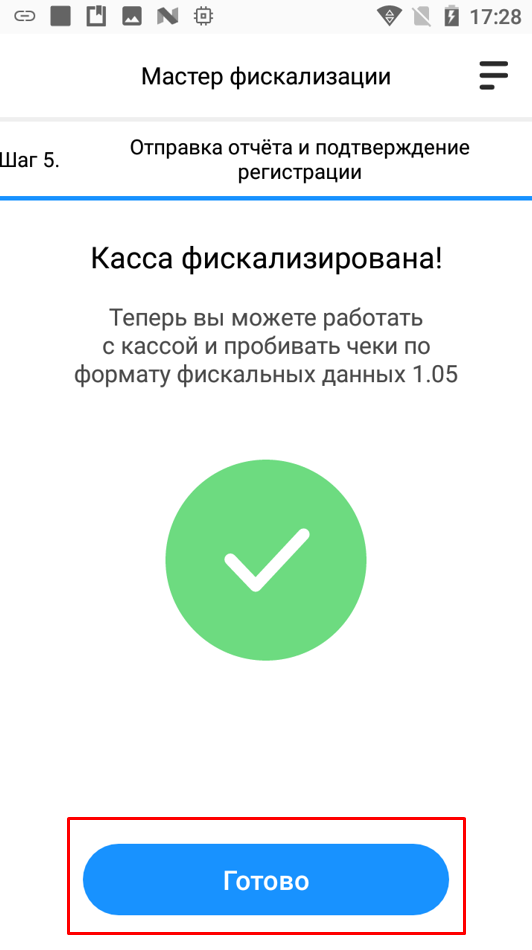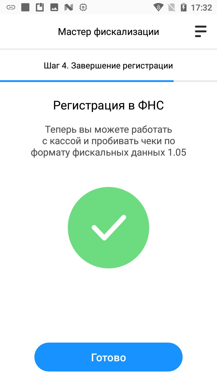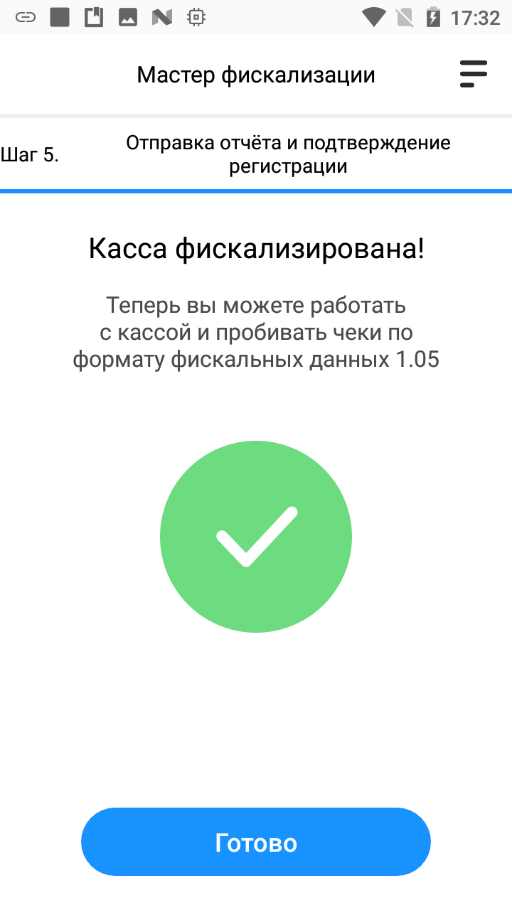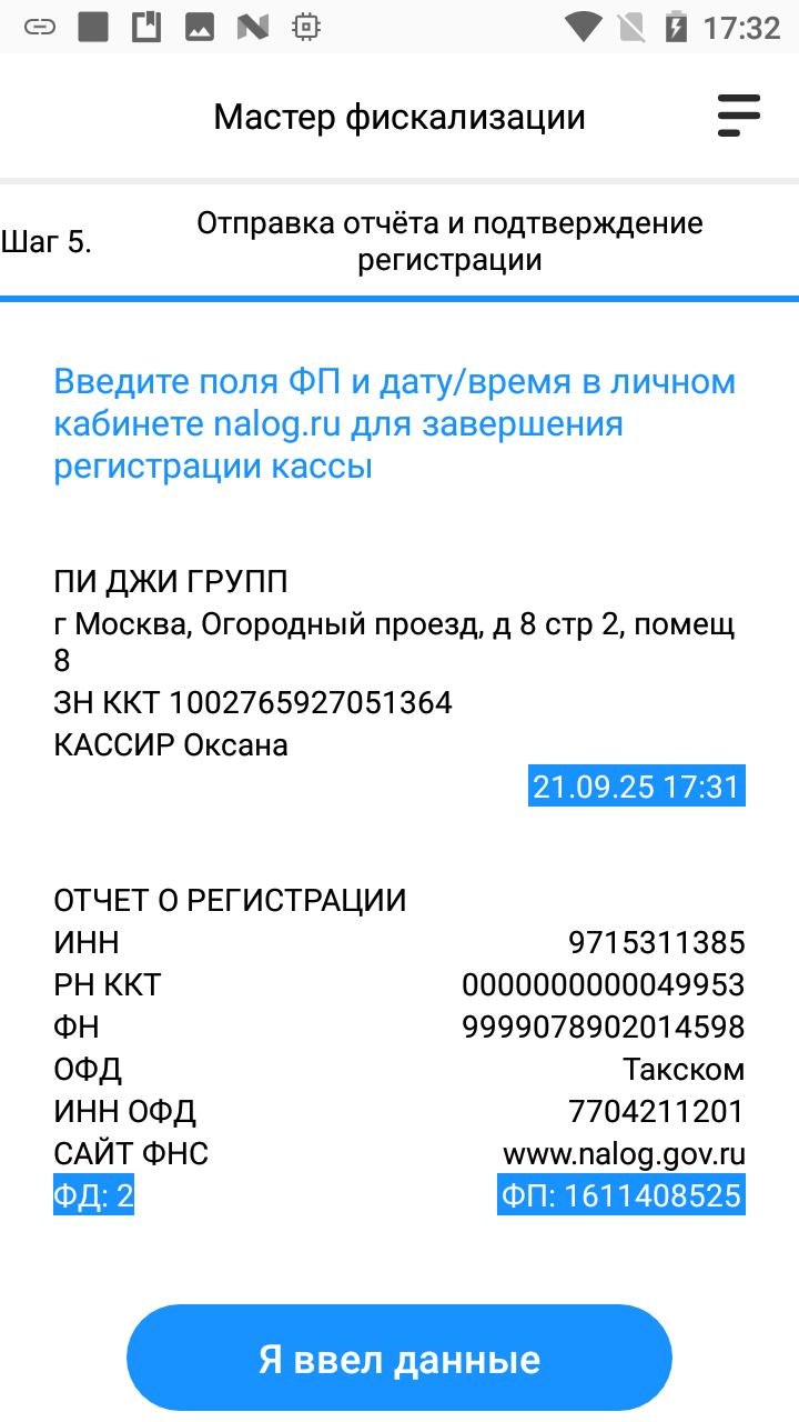 - Если данные корректные, нажмите на кнопку “Зарегистрировать кассу”, касса распечатает итоговый отчет о регистрации устройства