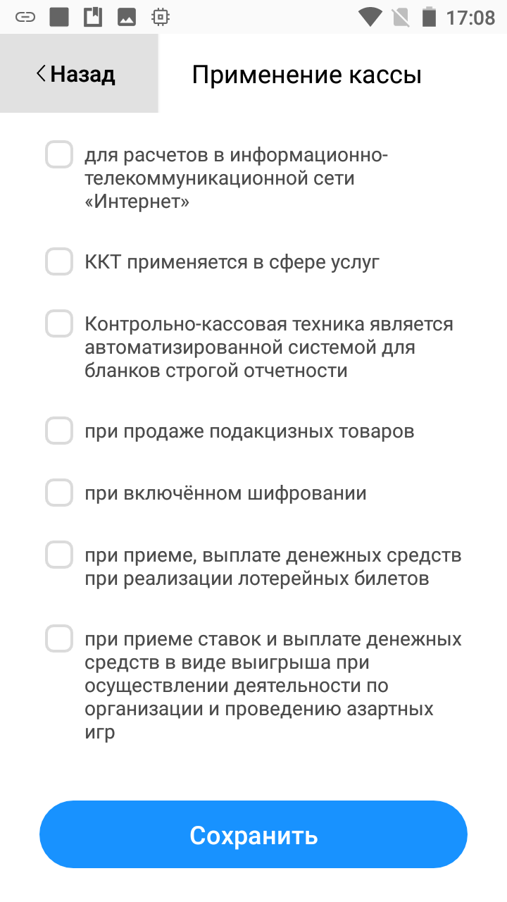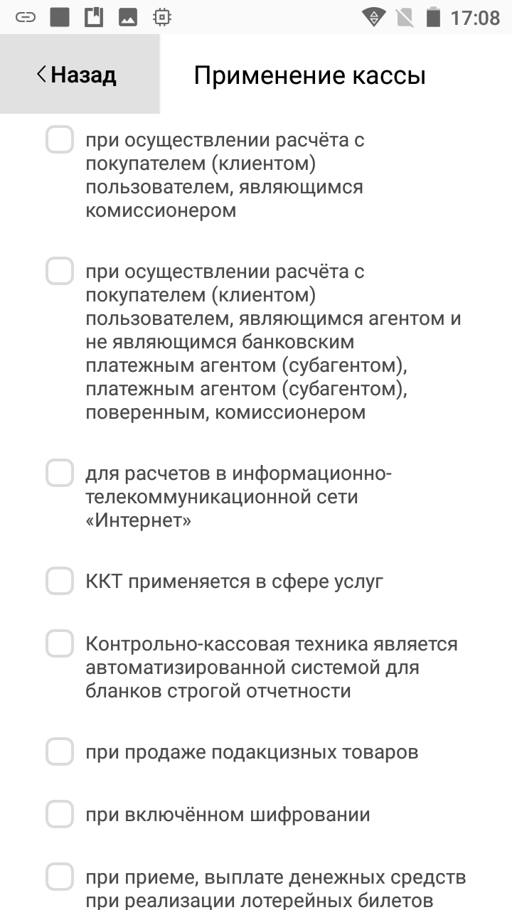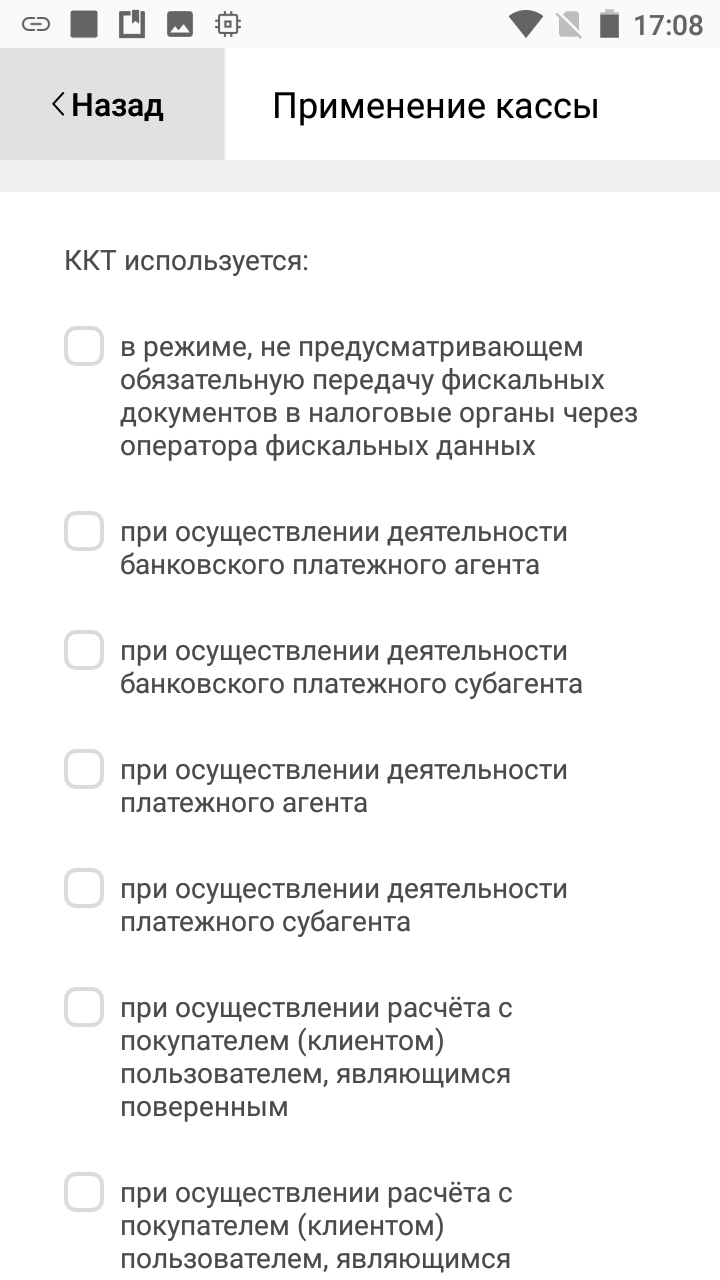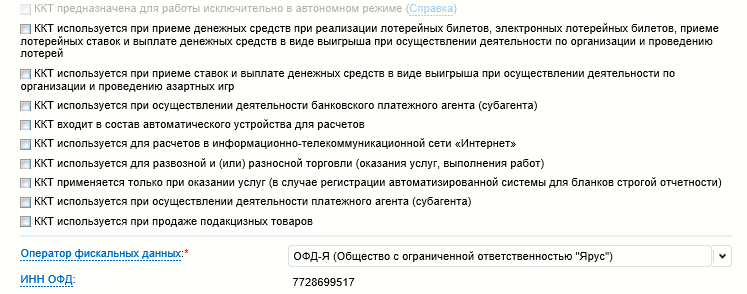 - Нажмите на “Сведения о применении кассы” и выберите все параметры, которые соответствуют роду вашей деятельности и были выбраны при регистрации ККТ в ФНС