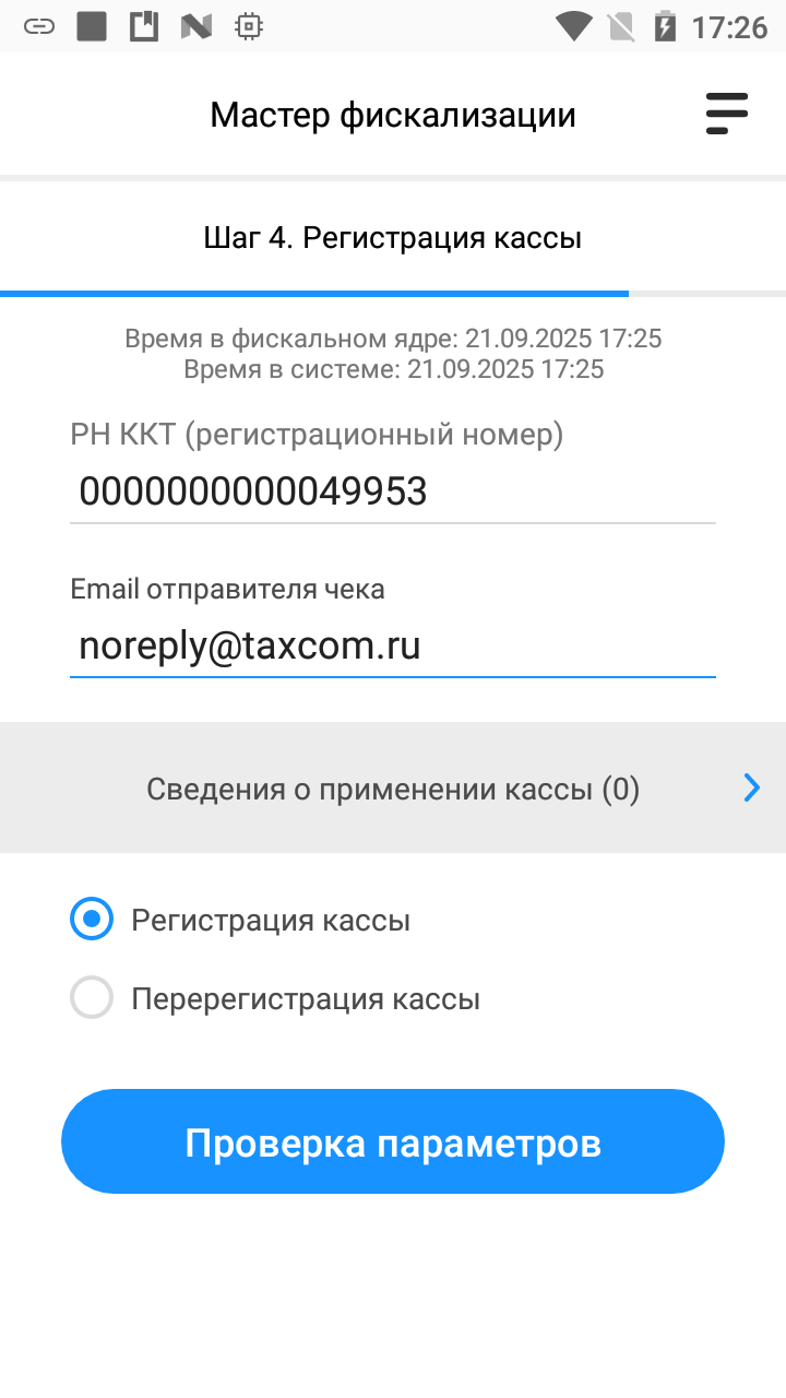 При первичной регистрации ККТ выберите “Регистрация кассы”. Заполните адрес электронной почты отправителя чека. Узнать адрес отправителя чека вы можете на сайте своего ОФД