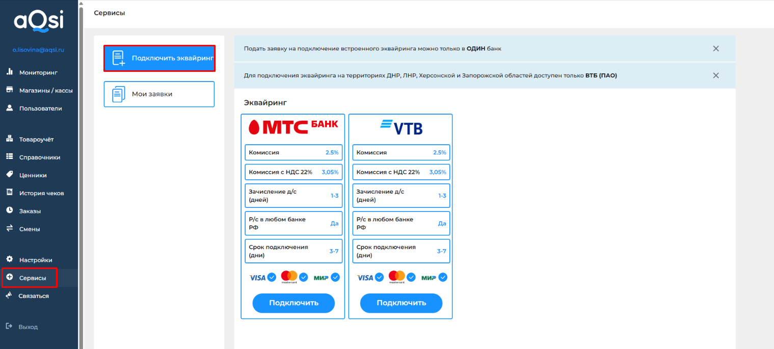 Подключая эквайринг через aQsi, деньги будут поступать на расчетный счет любого банка Российской Федерации