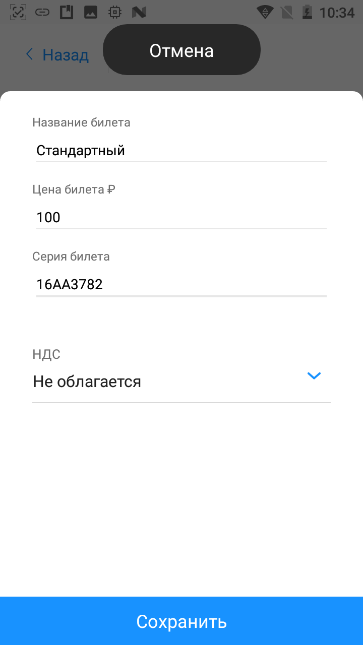 После того как маршрут будет сохранен, провалитесь в него и нажмите кнопку “Создать билет”. При создании билета укажите название билета, цену билета в рублях, серию билета и ставку НДС. Сохраните.